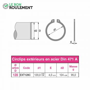 Circlip exterior de acero. Está diseñado para ser instalado sobre un diámetro 128 mm y cuando lo medimos antes instalación mide 120 mm de diámetro interior. Su espesor es de 4 mm.