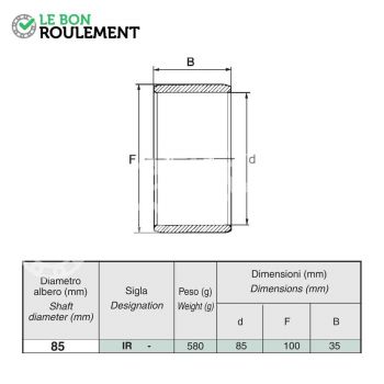 Aro interior de acero para rodamiento de agujas, marca genérica. Sus cotas en mm son 85x100x35.