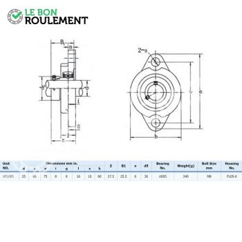 Unidad de rodamiento completo ovalado de aluminio con rodamiento fijación con anillo excéntrico genérico. Tiene un agujero de 25 mm y una entrevía de 75 mm.