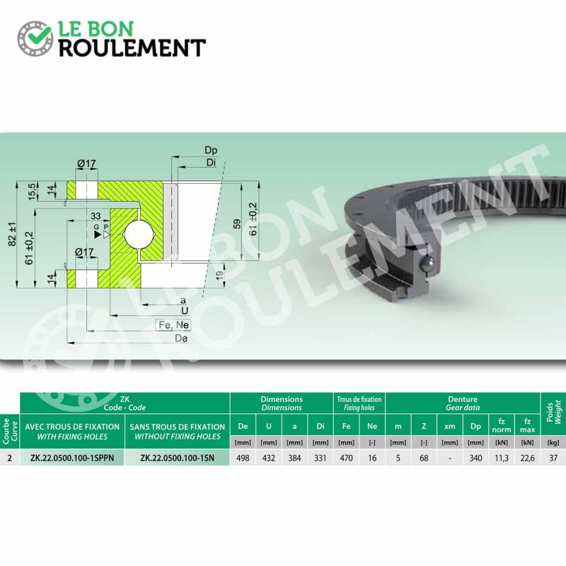 Rodamiento de orientación también llamado rodamiento de base. Marca genérica cotas 331 x 498 x 82, dentado interior ligero 1 hilera de bolas. Juego estándar y agujeros de fijación exterior e interior presillas estándar
