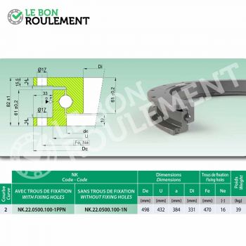 Rodamiento de orientación también llamado rodamiento de base. Marca genérica cotas 331 x 498 x 82, dentado ninguna ligere 1 hilera de bolas. Juego estándar y agujeros de fijación exterior e interior presillas estándar