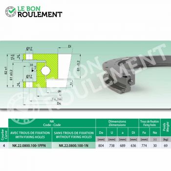 Rodamiento de orientación también llamado rodamiento de base. Marca genérica cotas 636 x 804 x 82, dentado ninguna ligere 1 hilera de bolas. Juego estándar y agujeros de fijación exterior e interior presillas estándar