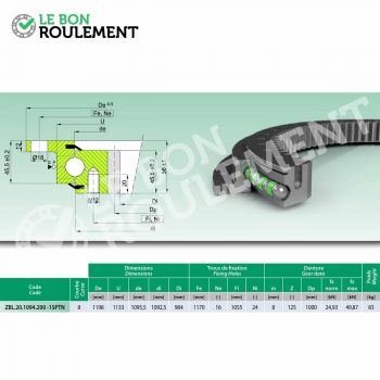 Rodamiento de orientación también llamado rodamiento de base. Marca genérica cotas 1092,5 x 1198 x 56, dentado interior con collarín 1 hilera de bolas. Juego de precisión y agujeros de fijación exterior e interior presillas estándar