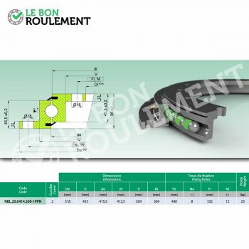 Rodamiento de orientación también llamado rodamiento de base. Marca genérica cotas 412,5 x 518 x 56, dentado ninguna con collarín 1 hilera de bolas. Juego estándar y agujeros de fijación exterior e interior presillas estándar