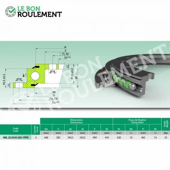 Rodamiento de orientación también llamado rodamiento de base. Marca genérica cotas 542,5 x 648 x 56, dentado ninguna con collarín 1 hilera de bolas. Juego estándar y agujeros de fijación exterior e interior presillas estándar