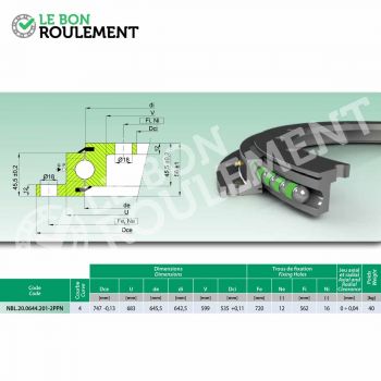Rodamiento de orientación también llamado rodamiento de base. Marca genérica cotas 642,5 x 748 x 56, dentado ninguna con collarín 1 hilera de bolas. Juego de precisión y agujeros de fijación exterior e interior presillas estándar