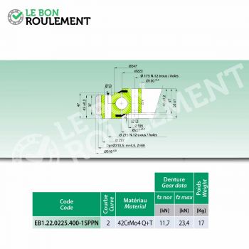 Rodamiento de orientación también llamado rodamiento de base. Marca genérica cotas 150 x 318 x 55, dentado exterior 1 hilera de bolas. Juego estánd... Más