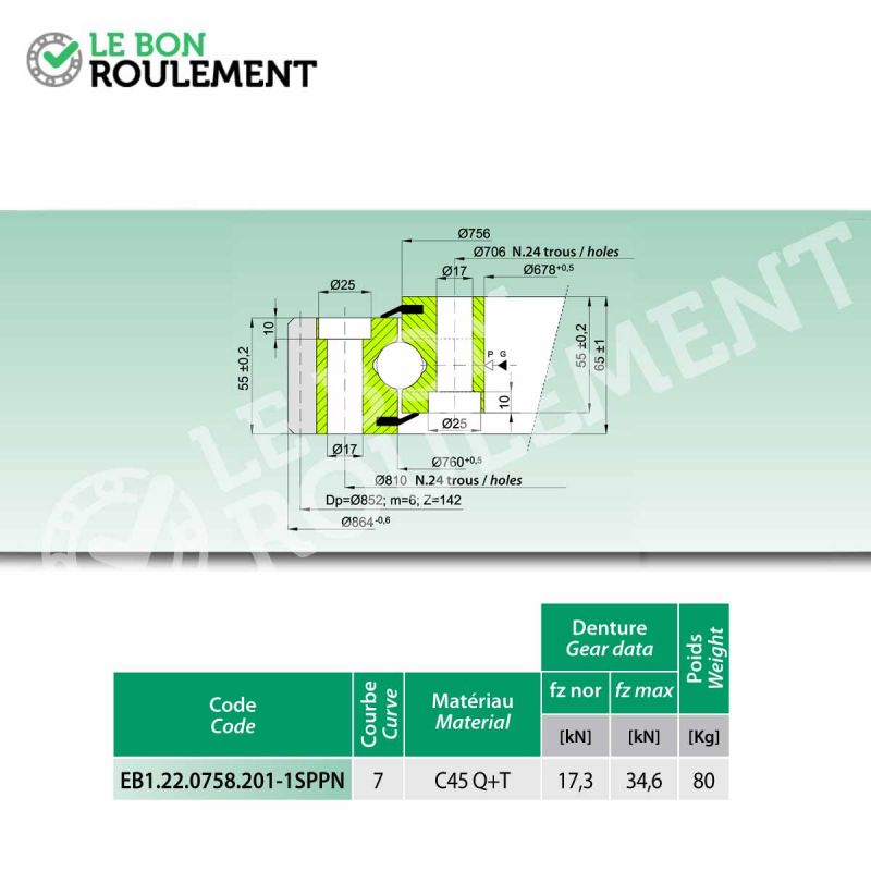 Rodamiento de orientación también llamado rodamiento de base. Marca genérica cotas 678 x 864 x 65, dentado exterior 1 hilera de bolas. Juego estándar y agujeros de fijación exterior e interior presillas estándar