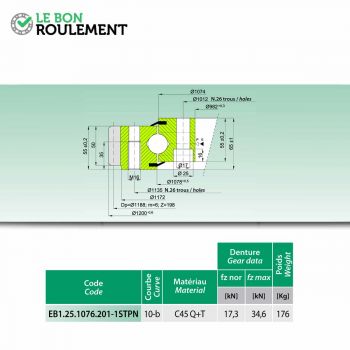 Rodamiento de orientación también llamado rodamiento de base. Marca genérica cotas 982 x 1200 x 65, dentado exterior 1 hilera de bolas. Juego estándar y agujero de fijaciones exteriores roscados e interior presillas estándar