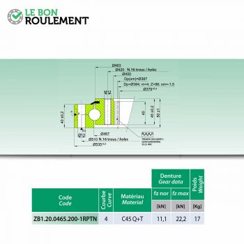 Rodamiento de orientación también llamado rodamiento de base. Marca genérica cotas 379 x 535 x 50, dentado interior 1 hilera de bolas. Juego estándar y agujeros de fijacións exterior passants estándar y agujero de fijación exterior presillas estándar e interior roscados