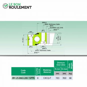 Rodamiento de orientación también llamado rodamiento de base. Marca genérica cotas 546 x 750 x 60, dentado interior 1 hilera de bolas. Juego estándar y agujeros de fijación exterior e interior presillas estándar