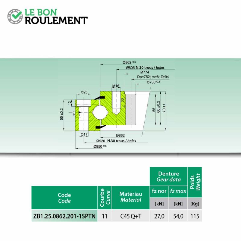 Rodamiento de orientación también llamado rodamiento de base. Marca genérica cotas 736 x 950 x 70, dentado interior 1 hilera de bolas. Juego estándar y agujeros de fijacións exterior passants estándar y agujero de fijación exterior presillas estándar e interior roscados