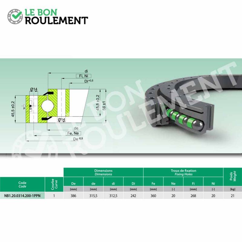Rodamiento de orientación también llamado rodamiento de base. Marca genérica cotas 242 x 386 x 56, denture aucune 1 rangée de billes. Juego estándar y agujeros de fijación exterior e interior presillas estándar