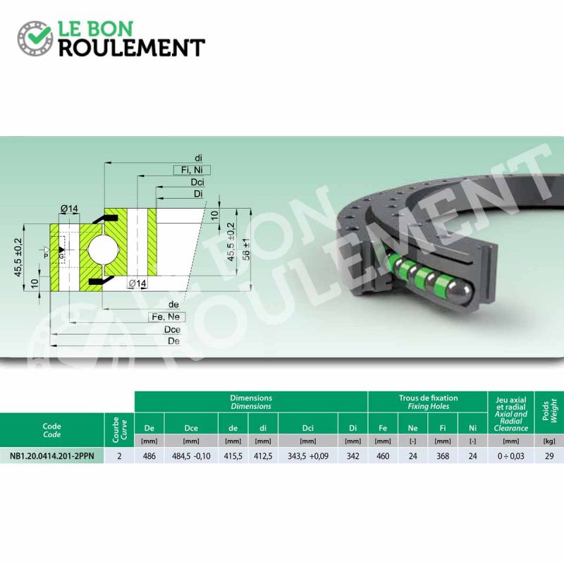 Rodamiento de orientación también llamado rodamiento de base. Marca genérica cotas 342 x 486 x 56, denture aucune 1 rangée de billes. Juego de precisión y agujeros de fijación exterior e interior presillas estándar
