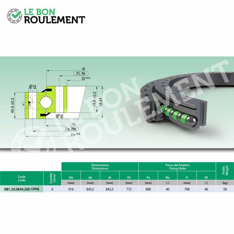 Rodamiento de orientación también llamado rodamiento de base. Marca genérica cotas 772 x 916 x 56, denture aucune 1 rangée de billes. Juego estándar y agujeros de fijación exterior e interior presillas estándar