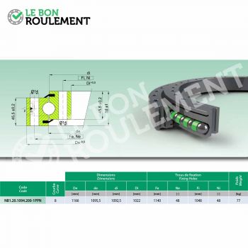 Rodamiento de orientación también llamado rodamiento de base. Marca genérica cotas 1022 x 1166 x 56, denture aucune 1 rangée de billes. Juego estándar y agujeros de fijación exterior e interior presillas estándar