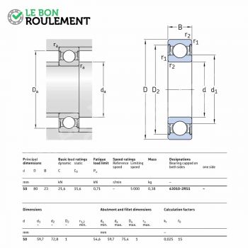 Rodamiento de bolas SKF. Sus cotas en mm son 50x80x23. Es doble estanco caucho y posee un juego estándar Más