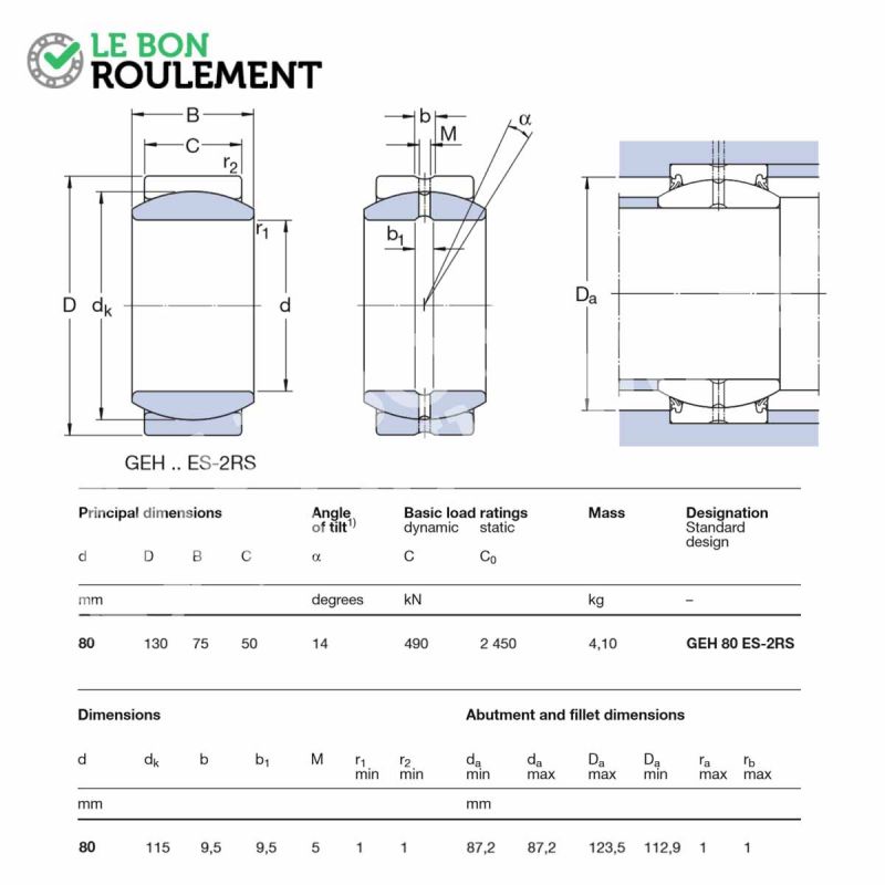 Rótula radial, gama alta. Marca SKF. Cotas en mm : 80x130x75/50Correspondencias con otras marcas de rótulas :Genérica : GEG80ES-2RSKML : GEG80ES-2R... Más