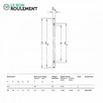 Rodamiento axial de agujas axiales SKF. Sus cotas en mm son 70x95x4. La jaula que mantiene las agujas es de acero.