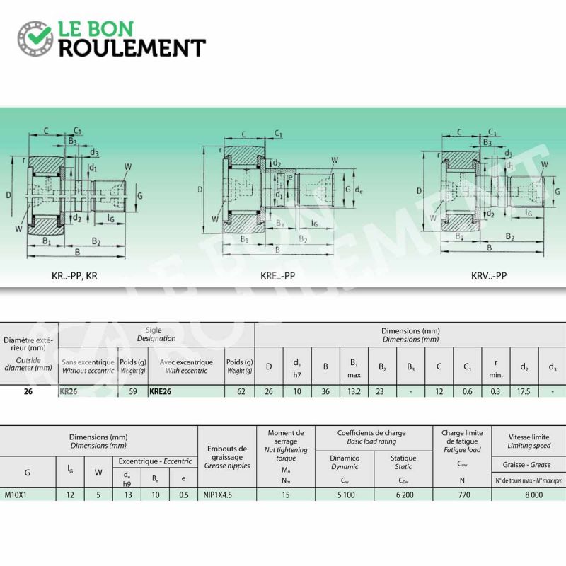 Rodillo de apoyo de agujas con eje de marca genérica. Tiene un diámetro exterior de 26 mm, una longitud de 36 mm y un roscado M10X100. No es estanco, no posee anillo excéntrico y su jaula exterior es abombada.