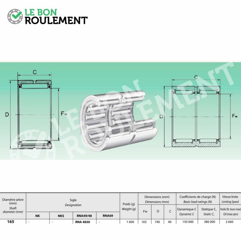 Rodamiento de agujas sin anillo interior de marca genérica. Sus cotas en mm son 165x190x40. No es estanco y la jaula que mantiene las agujas es de acero.