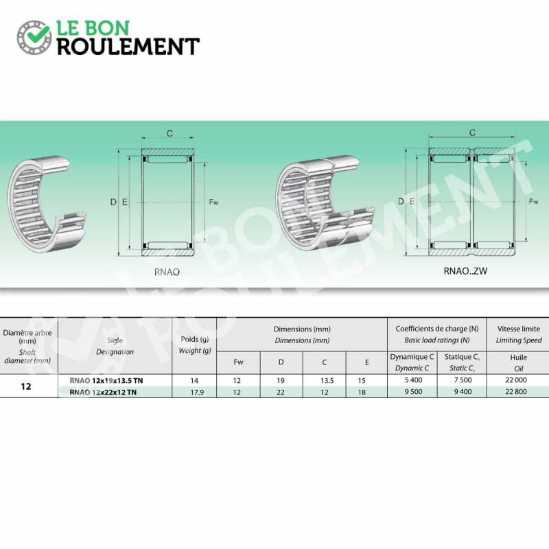 Rodamiento de agujas sin anillo interior genérico. Sus cotas en mm son 12x22x12. La jaula que mantiene las agujas es de poliamido.