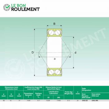 Rodamiento de bolas de contacto oblicuo genérico. Sus cotas en mm son 15x42x19. Posee una doble estanqueidad caucho con un juego C3 para altas velocidades y una jaula poliamida también llamada jaula plástica.