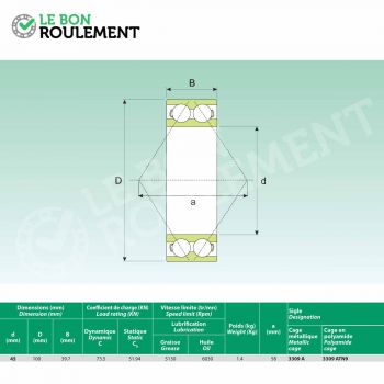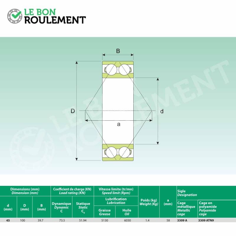 Rodamiento de bolas de contacto oblicuo genérico. Sus cotas en mm son 45x100x39,5. No es estanco con un juego estándar y una jaula poliamida también llamada jaula plástica.