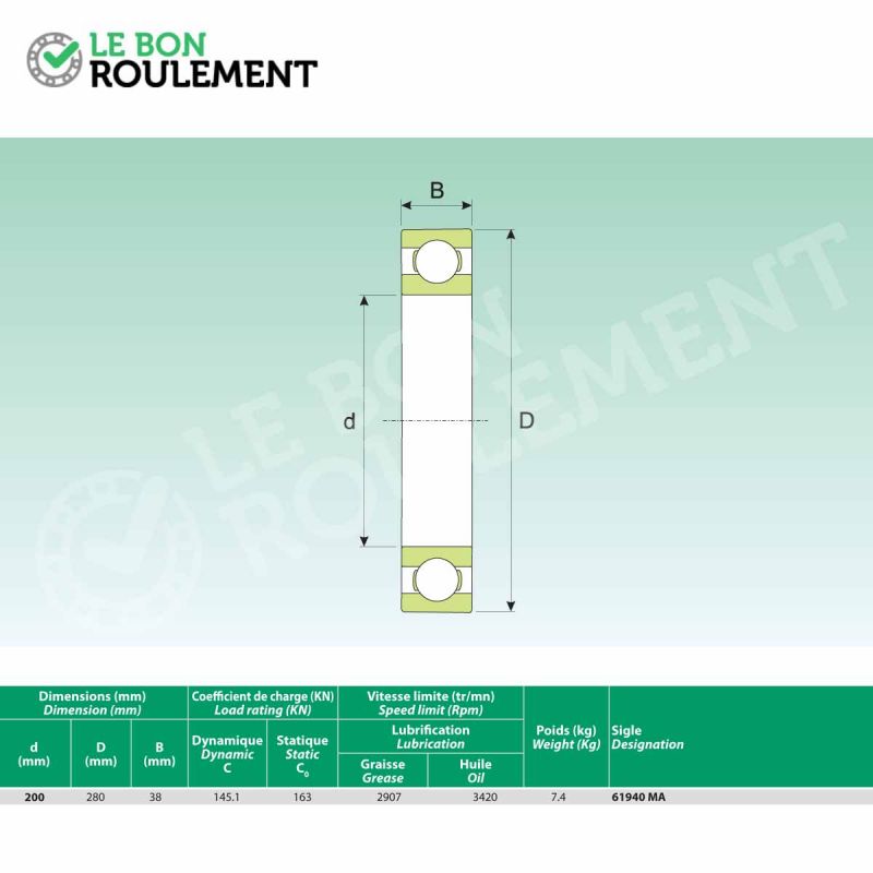 Rodamiento de bolas genérico. Sus cotas en mm son 200x280x38. No es estanco y posee un juego estándar. La jaula que mantiene las bolas es de latón también llamada jaula bronce.