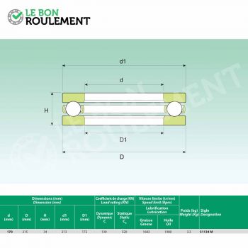 Rodamiento axial de bolas genérico. Sus cotas en mm son 170x215x34. Su jaula de latón también es llamada jaula bronce.
