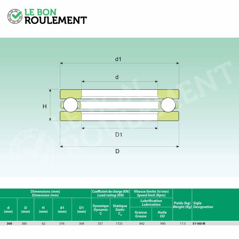 Rodamiento axial de bolas genérico. Sus cotas en mm son 300x380x62. Su jaula de latón también es llamada jaula bronce. Más