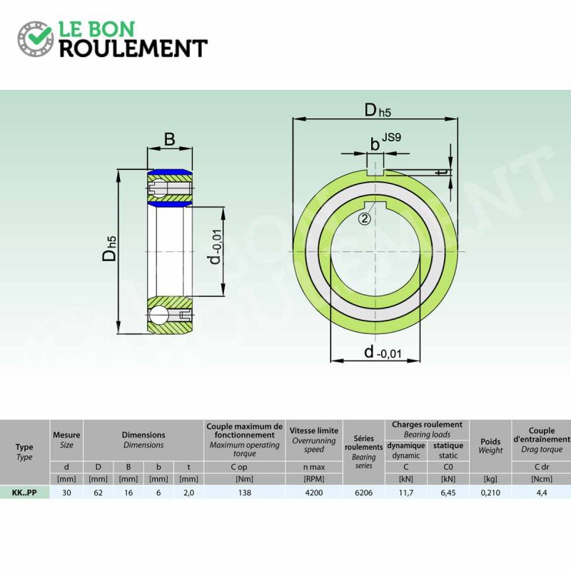 Rueda libre de rodillos con ranura sobre anillo interno y externo no estanco de marca genérica. Sus cotas en mm son 30x62x16. Más