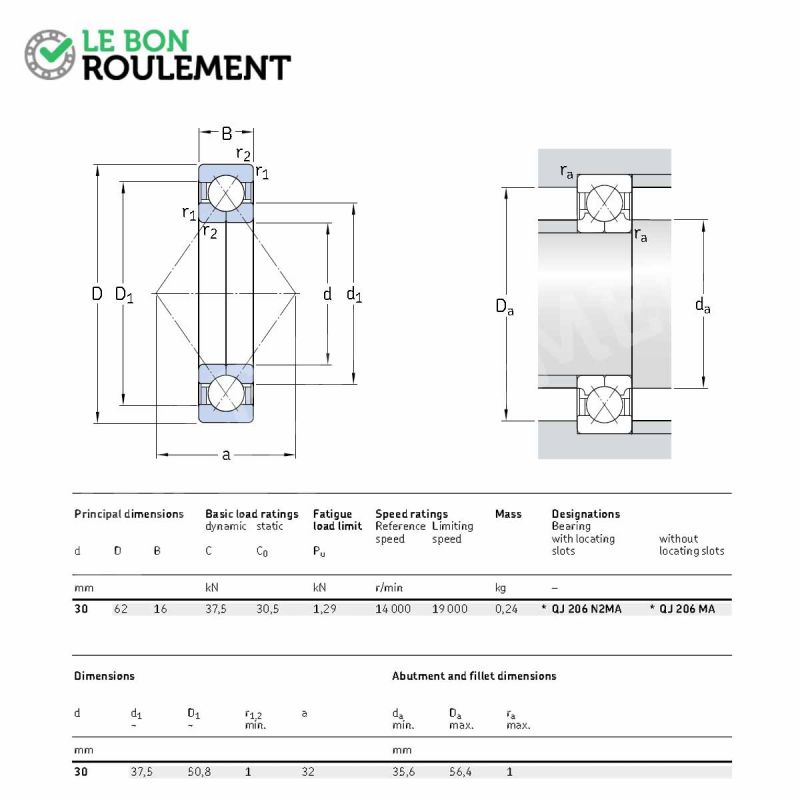 Rodamiento de bolas con cuatro puntos de contacto SKF. Sus cotas en mm son 30x62x16.Tiene un juego estándar y una jaula de latón también llamada jaula bronce.