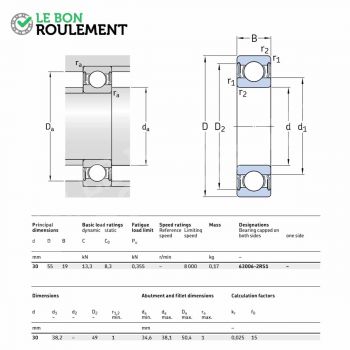 Rodamiento de bolas SKF. Sus cotas en mm son 30x55x19. Es doble estanco caucho y posee un juego estándar Más