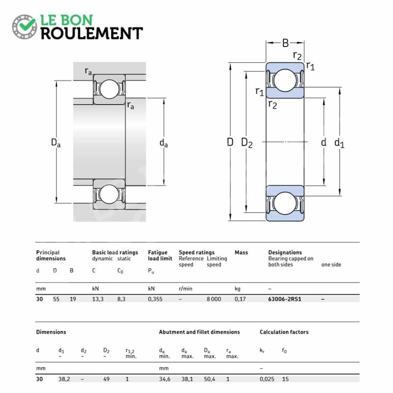 Rodamiento de bolas SKF. Sus cotas en mm son 30x55x19. Es doble estanco caucho y posee un juego estándar