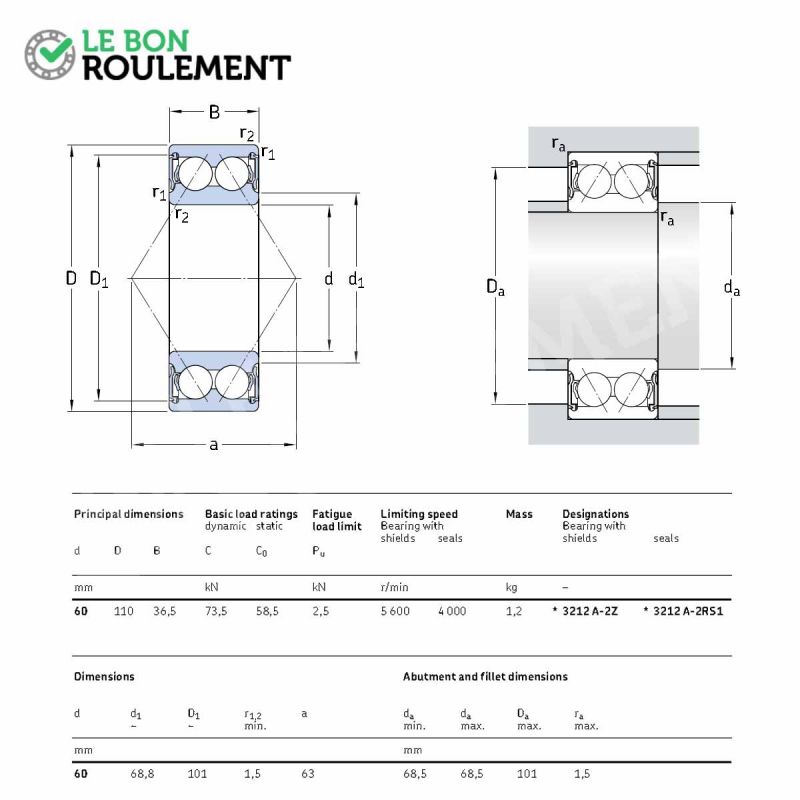 Rodamiento de bolas de contacto oblicuo SKF. Sus cotas en mm son 60x110x36,5. Posee una doble estanqueidad caucho con un juego estándar y una jaula poliamida también llamada jaula plástica.