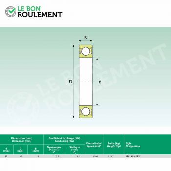 Rodamiento de bolas genérico. Sus cotas en mm son 25x42x9. Es doble estanco caucho y posee un juego estándar. La jaula que mantiene las bolas es de... Más