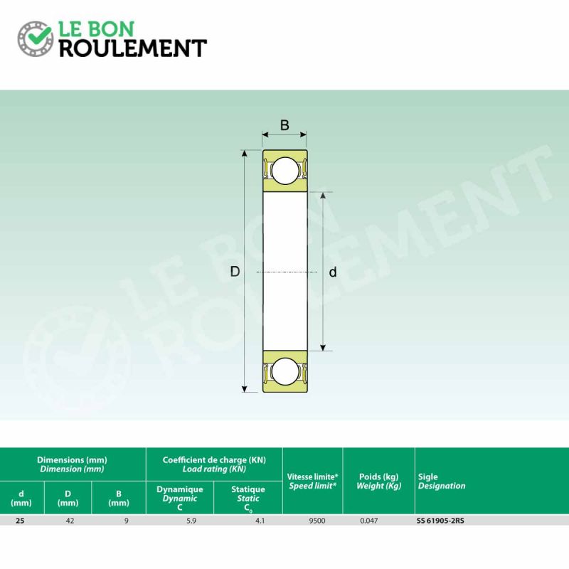 Rodamiento de bolas genérico. Sus cotas en mm son 25x42x9. Es doble estanco caucho y posee un juego estándar. La jaula que mantiene las bolas es de acero. Tiene la particularidad de ser de acero inoxidable.