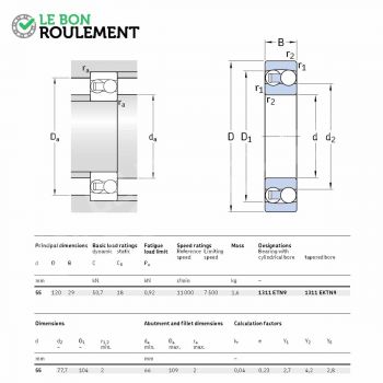 Rodamiento de bolas a rótula con dos hileras de marca SKF. Sus cotas en mm son 55x120x29. Tiene un juego entre las bolas de categoría C3 para alta velocidad y su jaula es de plástico también llamada jaula de poliamida. No es estanco. Su agujero es cilíndrico.