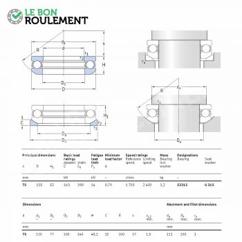 Rodamiento axial de bolas SKF. Sus cotas en mm son 75x135x48,1. Su jaula es de acero.