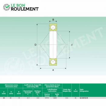 Rodamiento de bolas con cuatro puntos de contacto genérico. Sus cotas en mm son 45x85x19.Tiene un juego estándar y una jaula de latón también llamada jaula bronce.