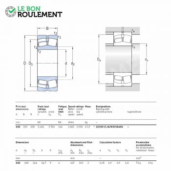 Rodamiento de dos hileras de rodillos a rótula SKF. Sus cotas en mm son 150x320x108.Tiene un juego entre los rodillos de categoría estándar y su jaula es de acero. No es estanco. Su agujero es cilíndrico. Está diseñado especialmente para aplicaciones vibrantes como por ejemplo una criba u otras máquinas.