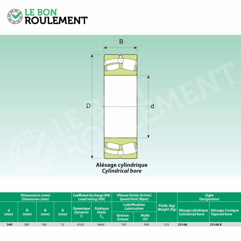 Rodamiento de dos hileras de rodillos a rótula genérico. Sus cotas en mm son 340x580x190. Tiene un juego entre los rodillos de categoría estándar y su jaula es de latón también llamada jaula bronce. No es estanco. Su agujero es cilíndrico.