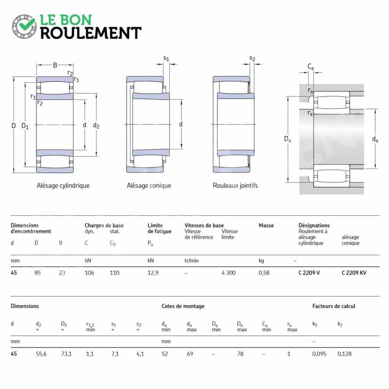 Rodamiento de una hilera de rodillos toroidales SKF. Sus cotas en mm son 45x85x23. No es estanco y los rodillos no son mantenidos por una jaula. Tiene un agujero cónico y un juego entre los rodillos clasico, para velocidades normales.