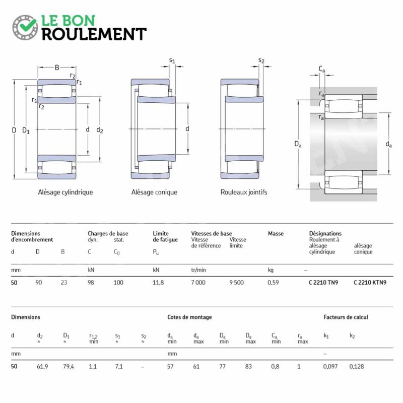 Rodamiento de una hilera de rodillos toroidales SKF. Sus cotas en mm son 50x90x23. No es estanco y su jaula es de poliamido. Tiene un agujero cónico y un juego entre los rodillos clasico, para velocidades normales.