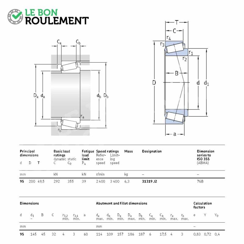 Rodamiento de rodillos cónicos SKF. Este rodamiento es completo, incluye el cono (la parte rodante) y la cubeta (la jaula exterior). Sus cotas en mm son 95x200x49,5.