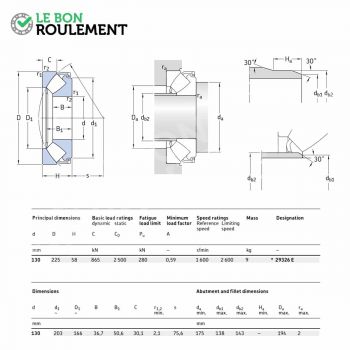 Rodamiento axial de rodillos cónicos SKF cuyas cotas en mm son 130x225x58. Tiene una jaula de acero. Más