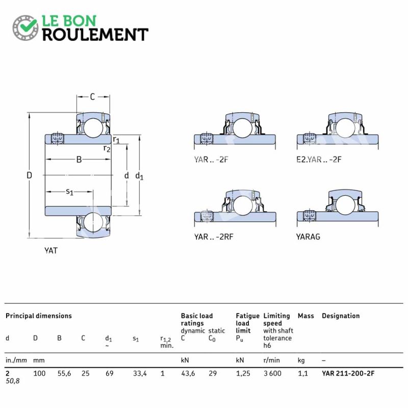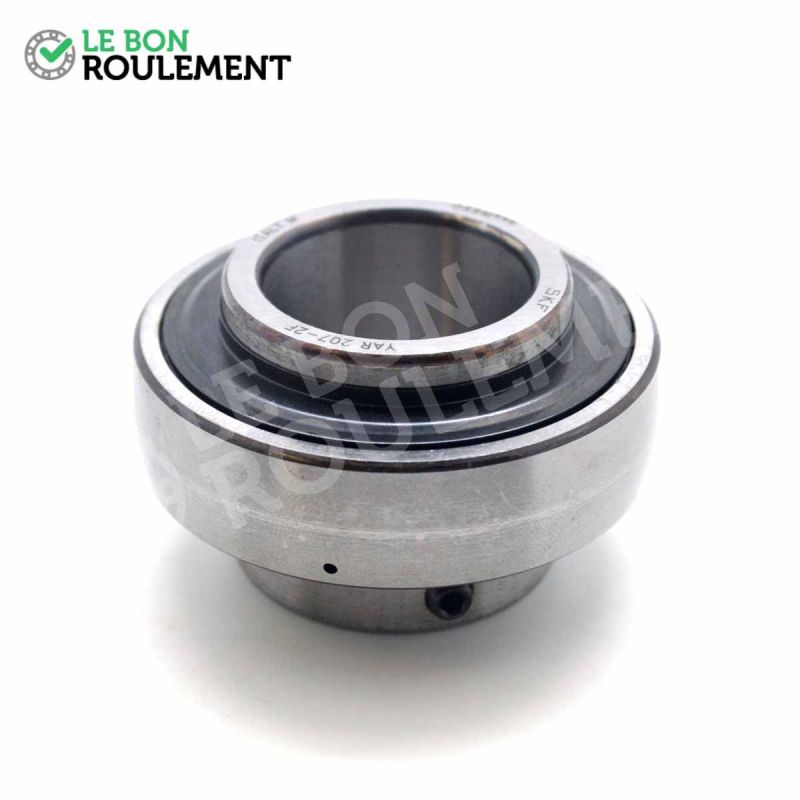 Rodamiento de soporte de marca SKF de alta calidad. Las cotas en mm son 50,8x100x55,6/25. Su jaula exterior es abombada y su fijación se hace con tornillos sin cabeza. El anillo interior se sale de ambos lados del rodamiento.