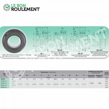 Rodamiento de soporte de marca genérica. Las cotas en mm son 25,4x52x21,5/15. Su jaula exterior es abombada y su fijación se hace con un anillo exc... Más
