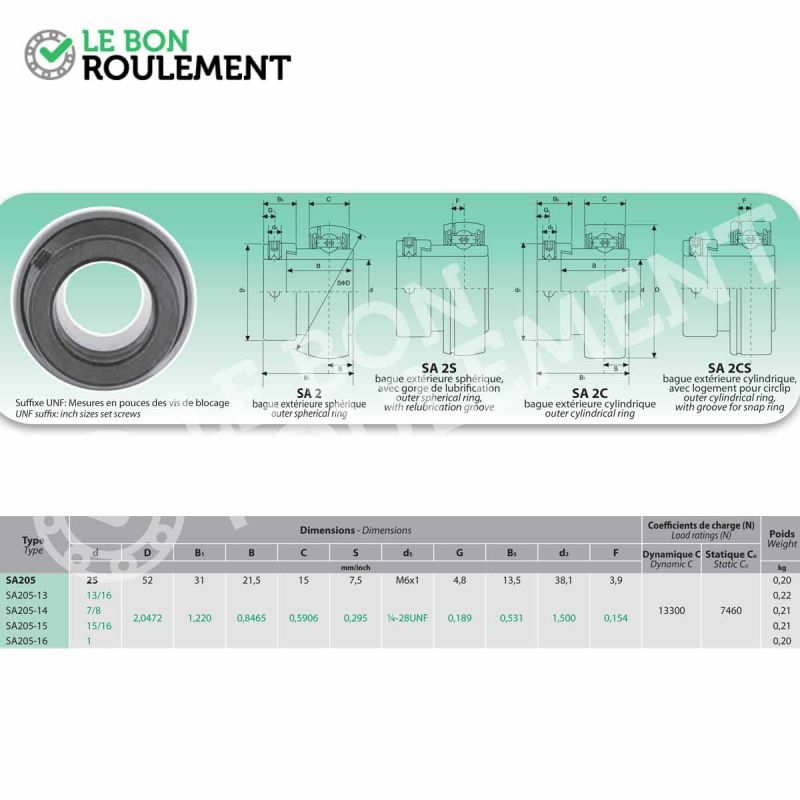 Rodamiento de soporte de marca genérica. Las cotas en mm son 25,4x52x21,5/15. Su jaula exterior es abombada y su fijación se hace con un anillo excéntrico. El anillo interior se sale por un solo lado del rodamiento y es de acero inoxidable.
